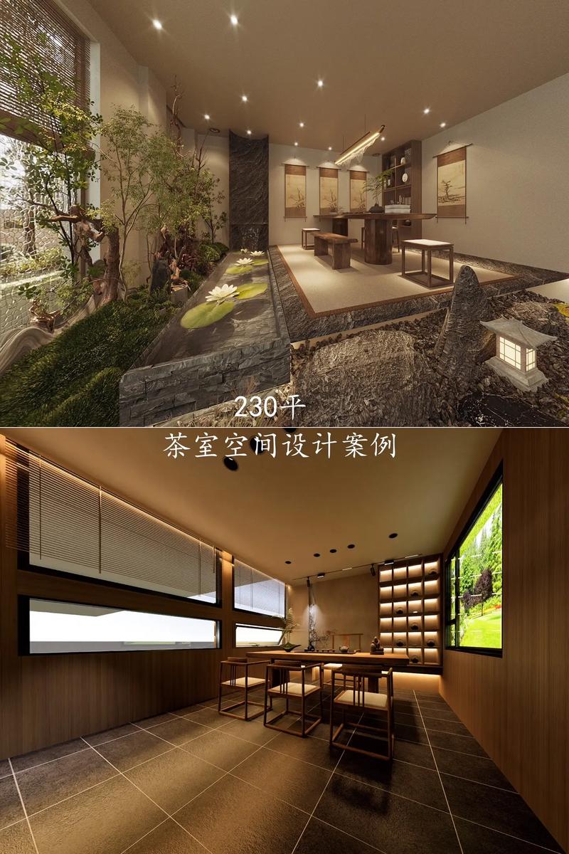 材质搭配:实木茶桌 / 格栅、水磨石地面、微水泥墙面、竹编灯罩、禅意绿植(琴叶榕、菖蒲、苔藓);
