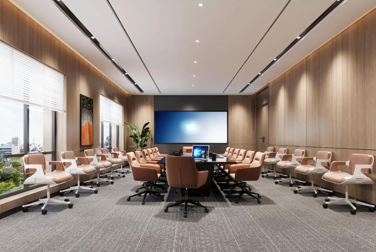 摒弃纯中式的繁复雕花与厚重装饰,萃取中式经典元素并进行现代简约化设计,以格栅、屏风、留白、水墨、实木等简约中式元素营造雅致氛围,色彩以胡桃木色、紫檀色、水墨灰、米白等中式经典色调为主,让空间兼具中式文化的雅致与现代设计的简洁,贴合商务办公的审美与氛围。